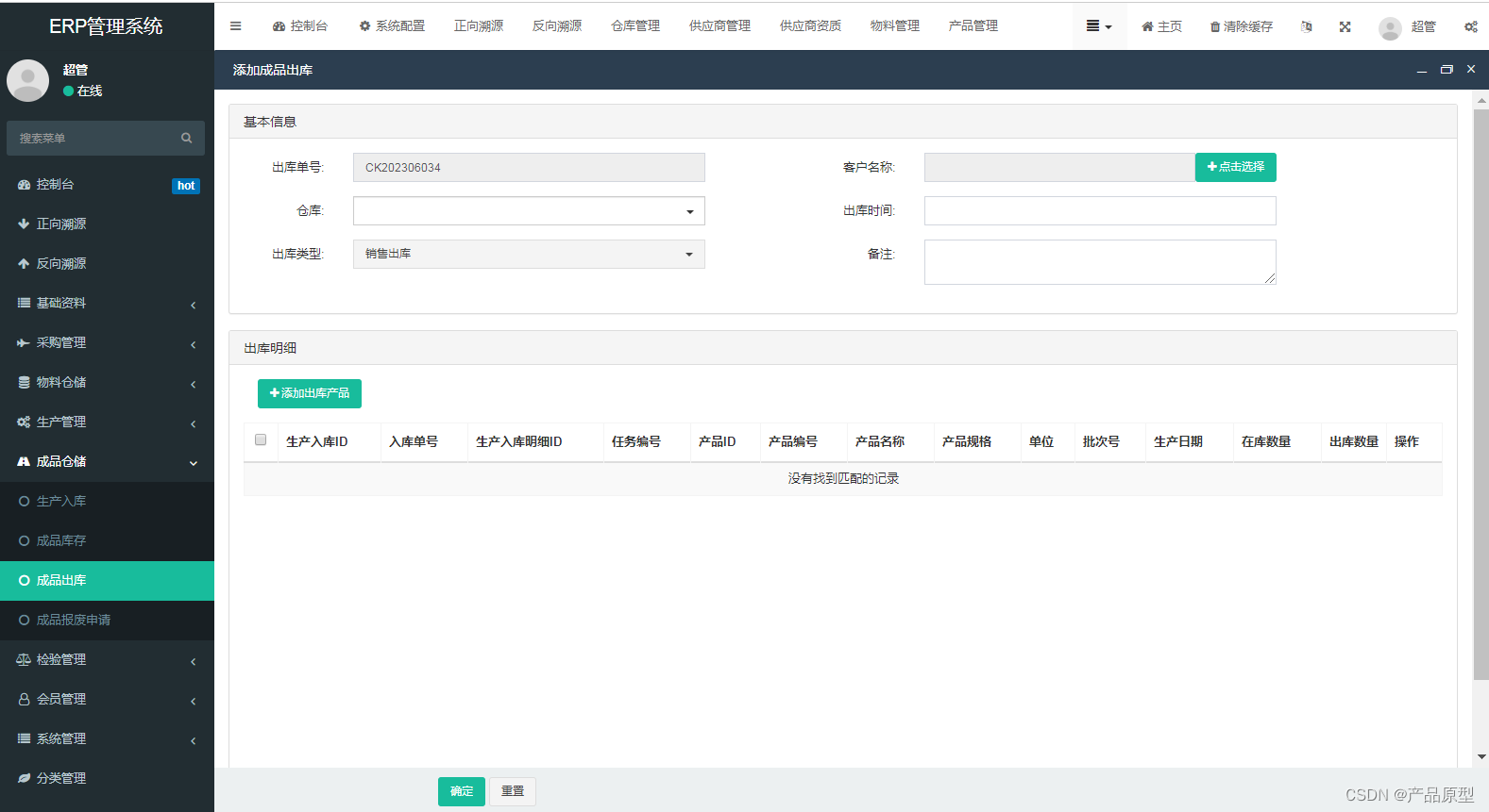 成品仓储:生产入库、成品库存、成品出库、成品报废申请等