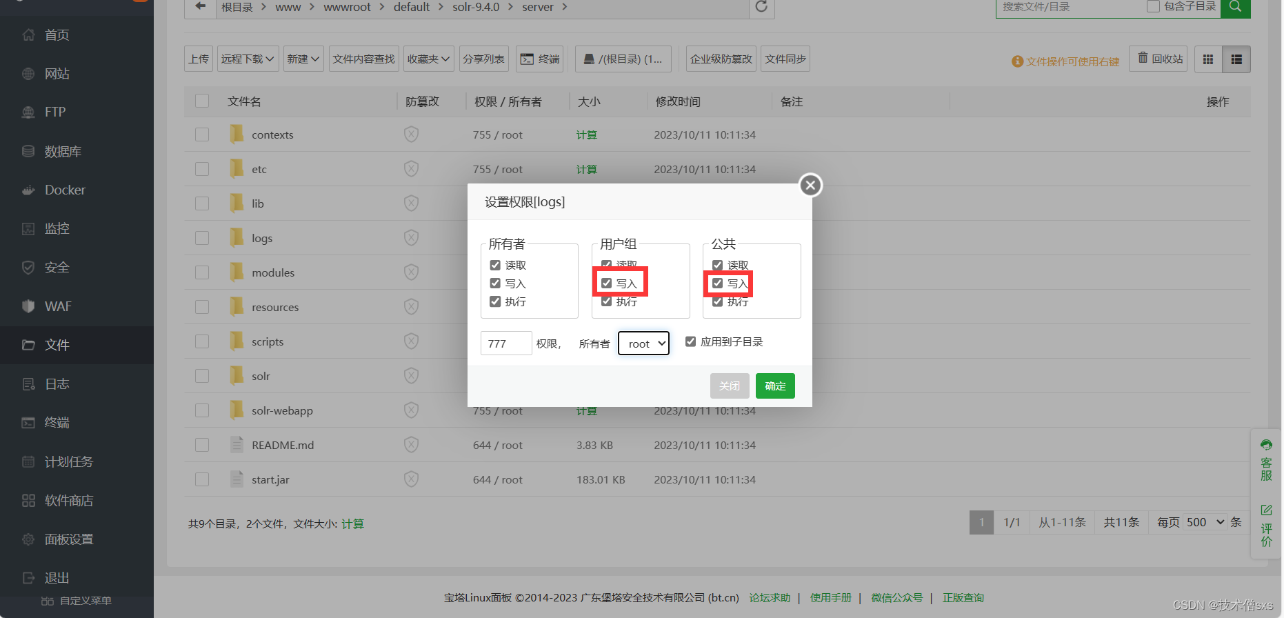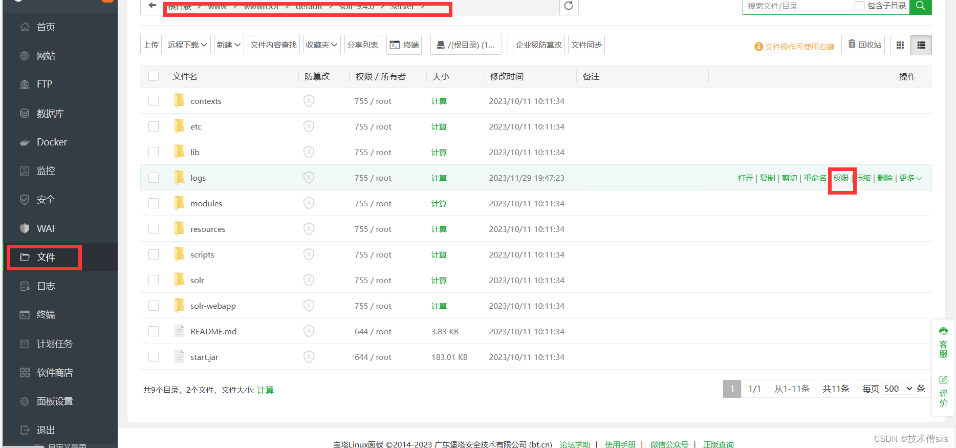 我们先来到华为云耀云服务器L实例的宝塔管理界面,点击文件找到solr根目录下的server目录,再找到logs文件夹,点击权限。
