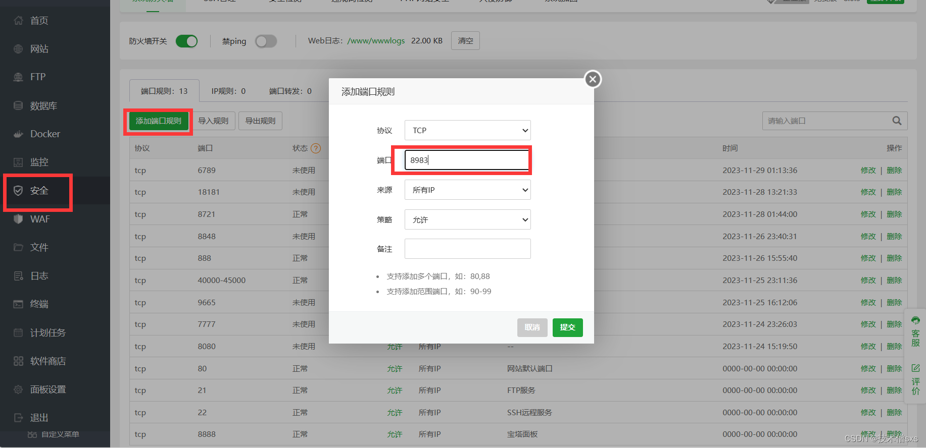 我们来到华为云服务器L实例的宝塔管理界面将端口8983开放(如果前面改过,这里记得换成自己改的端口),点击安全,添加端口规则,将8983添加进去。