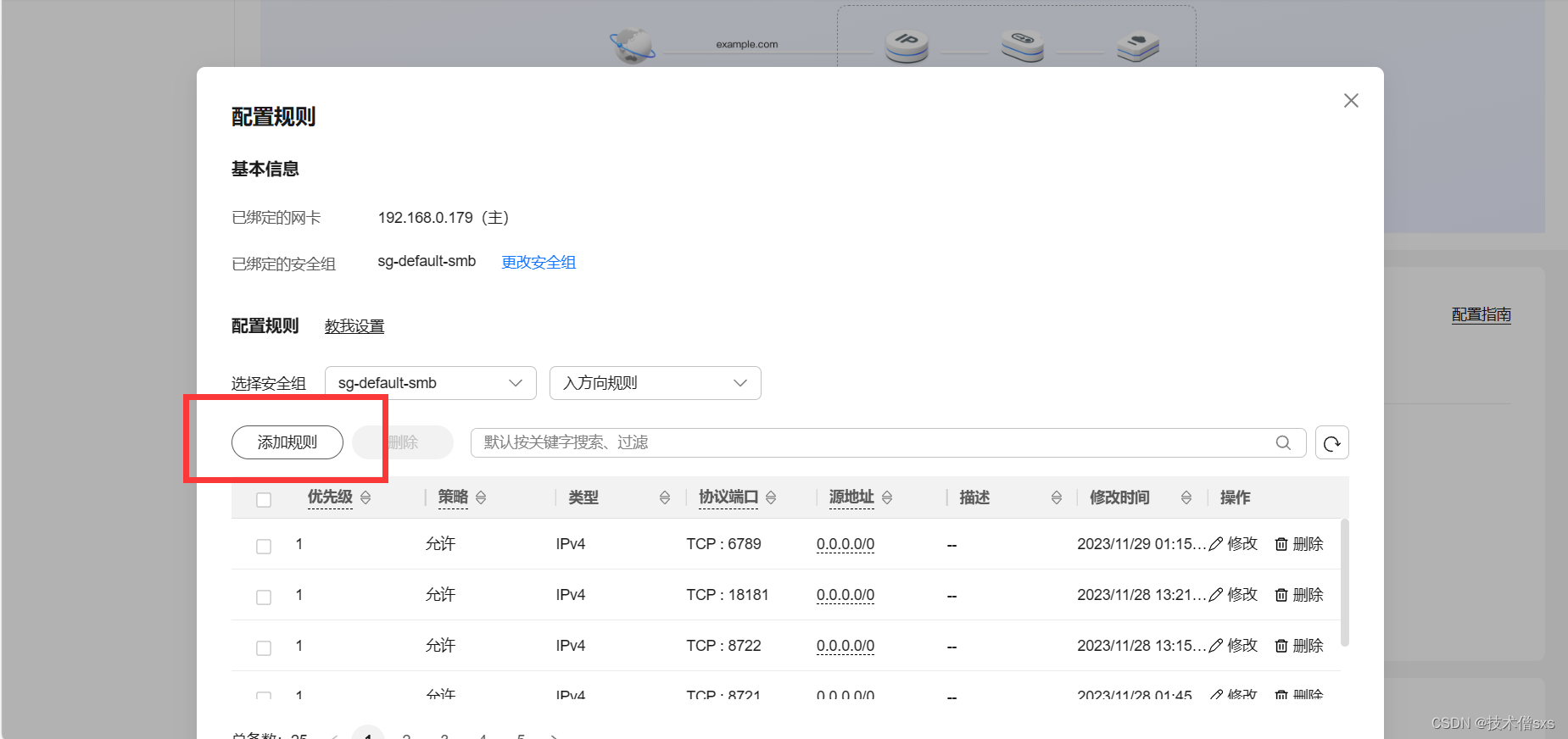 然后我们来到华为云耀云服务器L实例的控制台配置安全组,点击配置规则。