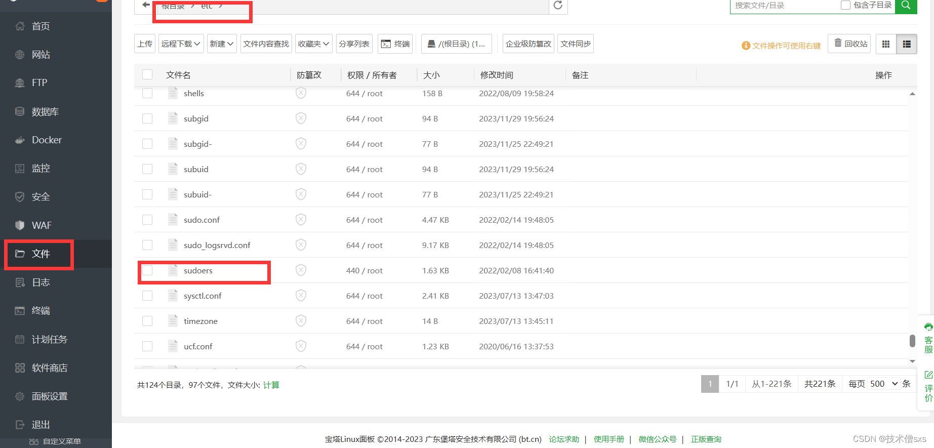 首先,我们使用华为云耀云服务器L实例的宝塔管理界面,来到文件,找到如下路径/etc下的/sudoers文件,双击打开。