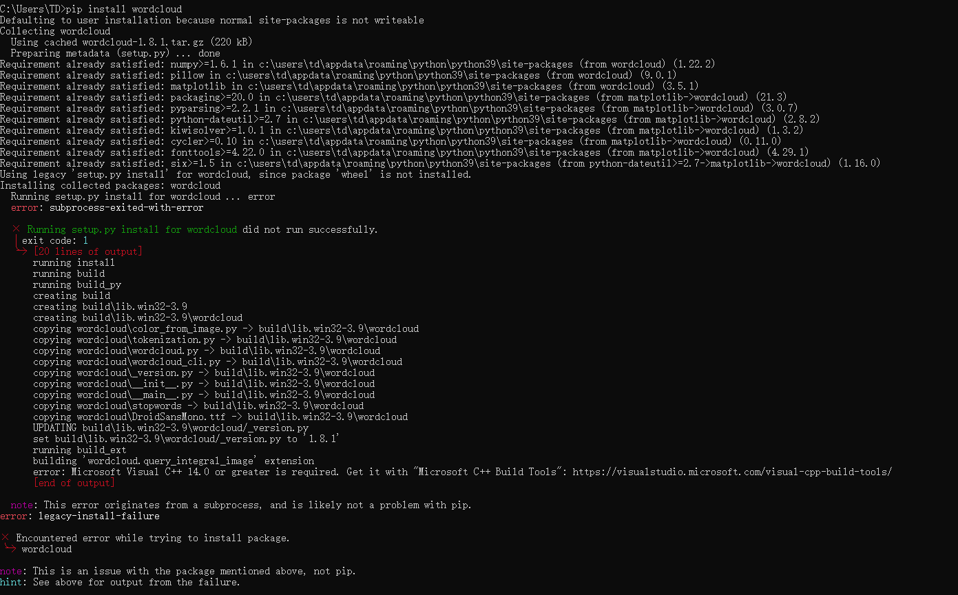 安装wordclou出现错误,请问一下什么原因 Defaulting to user installation because normal site-packages is not writeable Collecting wordcloud Using cached wordcloud-1.8.1.tar.gz (220 kB) Preparing metadata (setup.py) ... done Requirement already satisfied: numpy>=1.6.1 in c:\users\td\appdata..