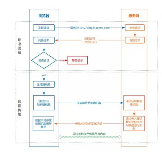 客户端发起 HTTPS请求,服务端返回证书,客户端对证书进行验证,验证通过后本地生成用于改造对称加密算法的随机数,通过证书中的公钥对随机数进行加密传输到服务端,服务端接收后通过私钥解密得到随机数,之后的数据交互通过对称加密算法进行加解密。