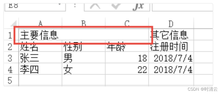 假设我们要生成如下格式的excel文件,其中A1-C1进行单元格合并: