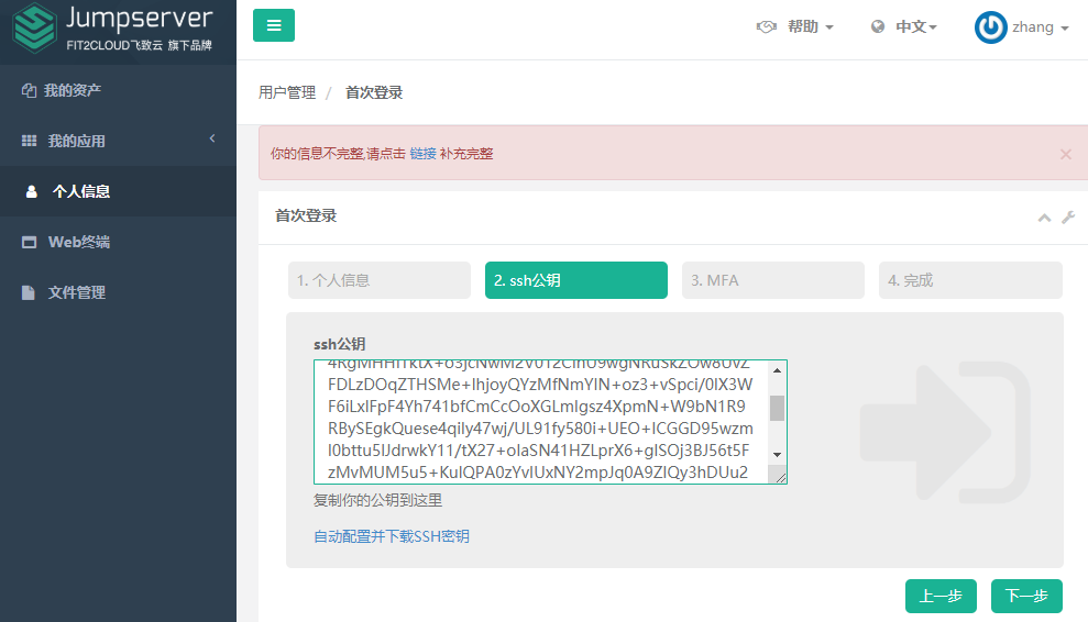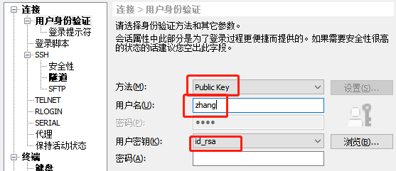 选择秘钥验证,用户名zhang,选择私钥文件(密钥在zhang登陆web页面后获取zhang_jumpserver.pem)