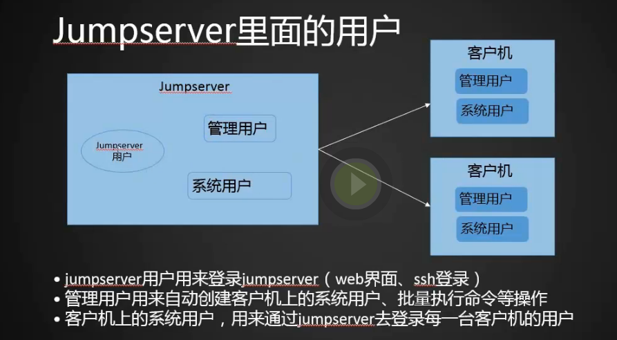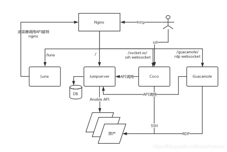 Jumpserver 采纳分布式架构, 支持多机房跨区域部署, 中心节点提供 API, 各机房部署登录节点, 可横向扩展、无并发访问限制。