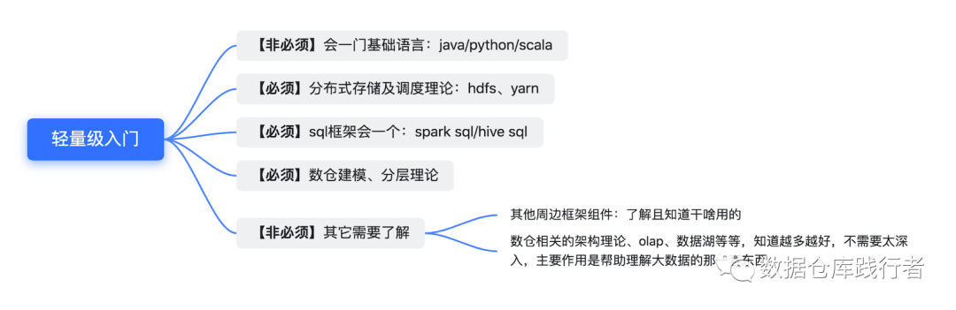 大数据相关的架构理论、olap、数据湖等等,知道越多越好,不需要太深入,主要作用是帮助理解大数据的那一套东西;网上的其它公司数仓的架构是啥样子,要知道架构里每个组件的作用是啥。