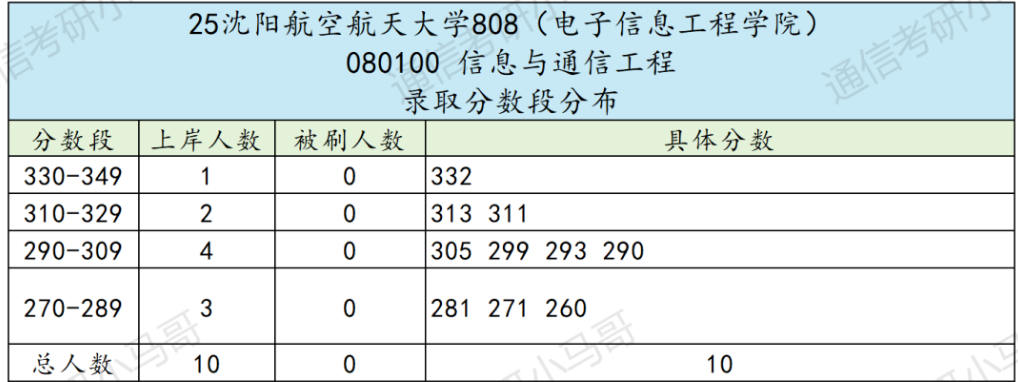 ②从分数段来看,录取考生主要集中在270-309分这个区间(共7人,占比70%),其中290-309分段人数最多(4人)。最让人意外的是,260分的考生也成功上岸了,这说明今年学硕的招生政策相当友好,只要过线就有很大机会被录取。
