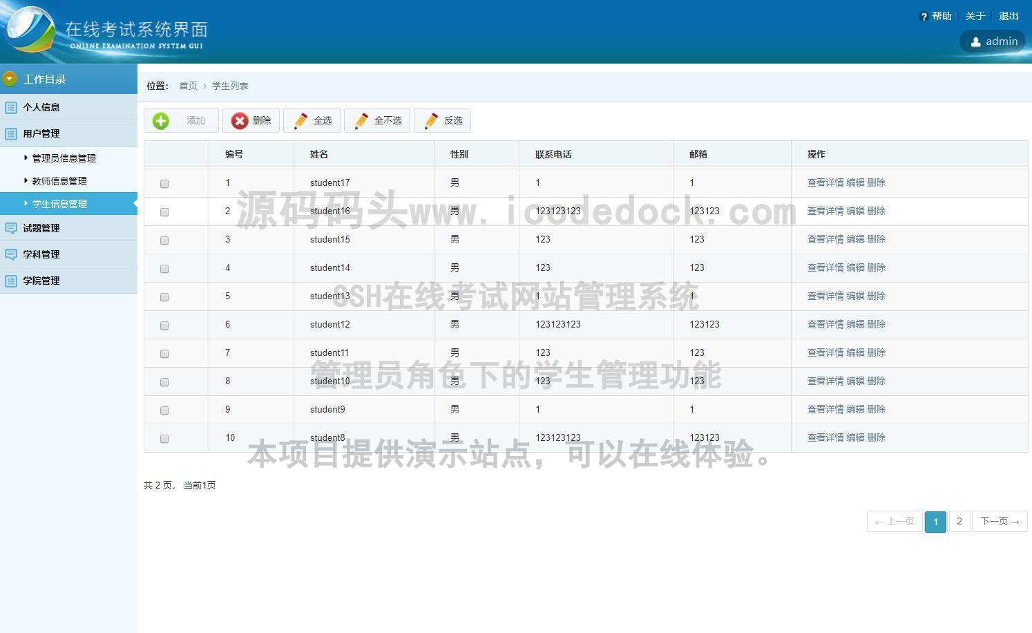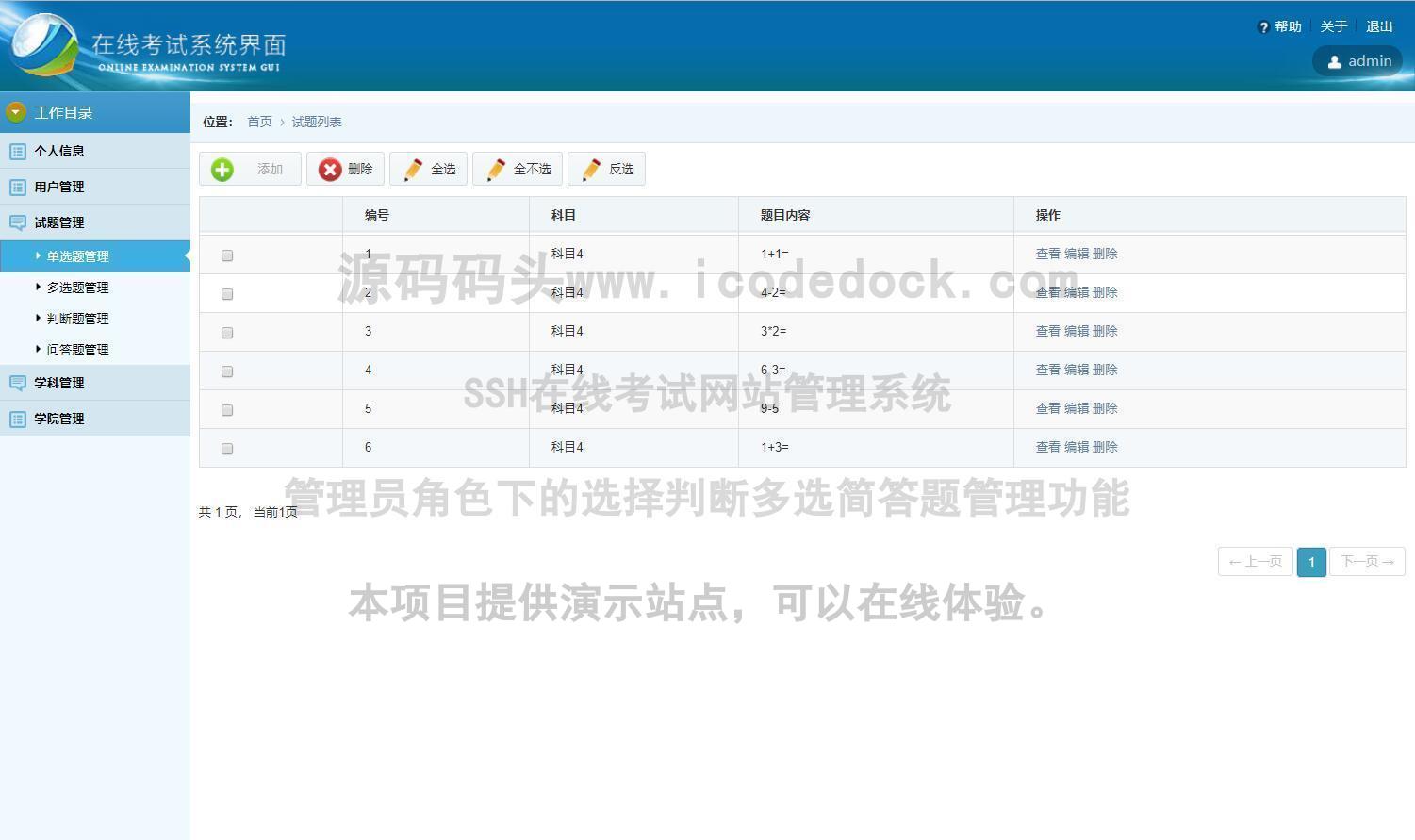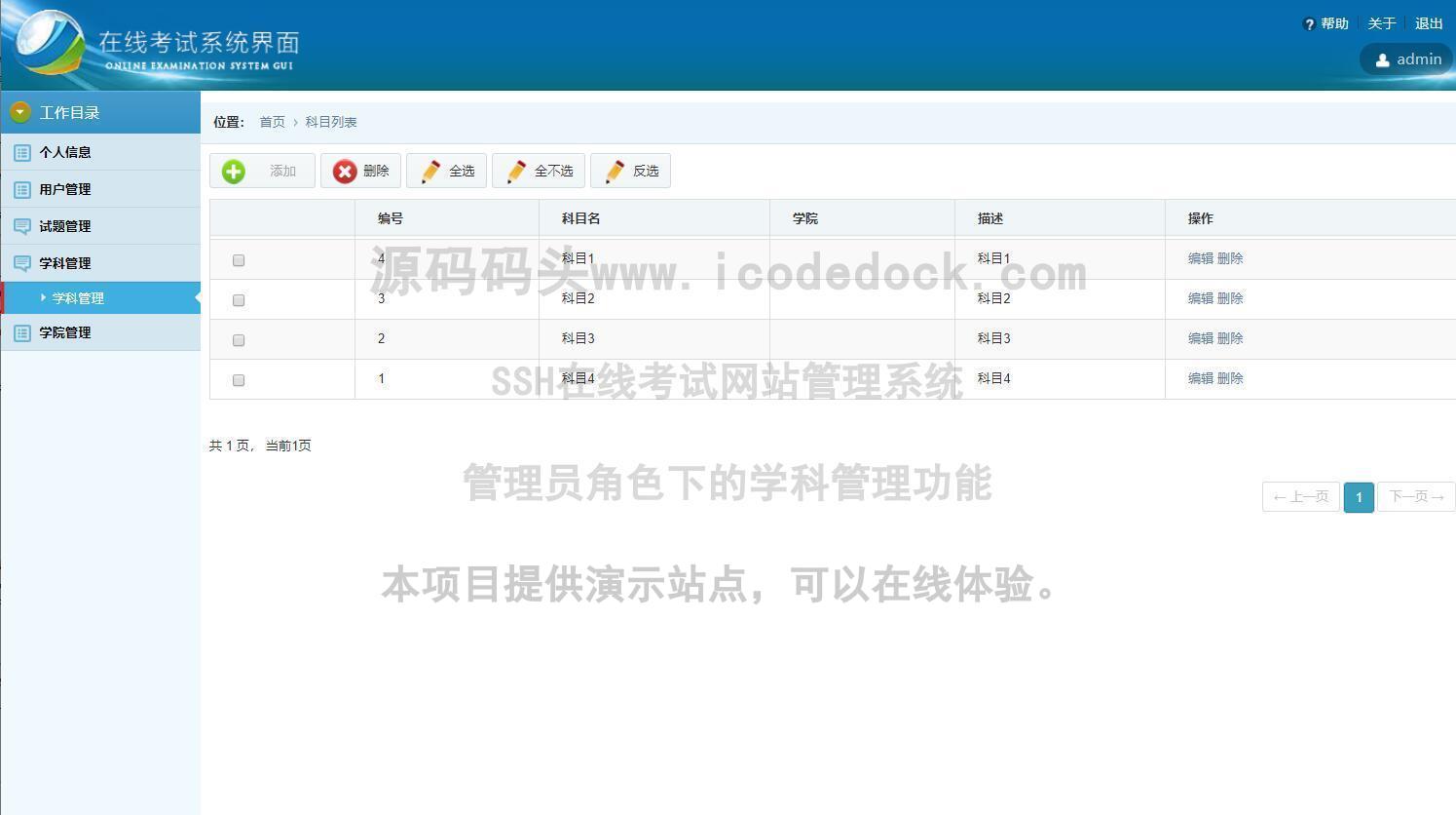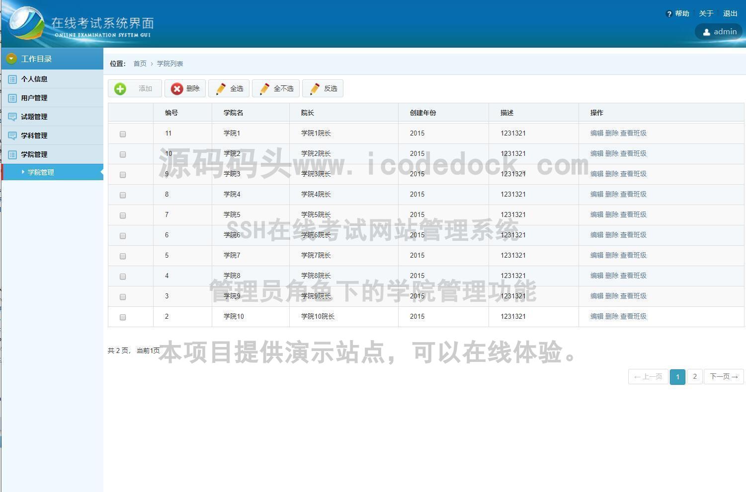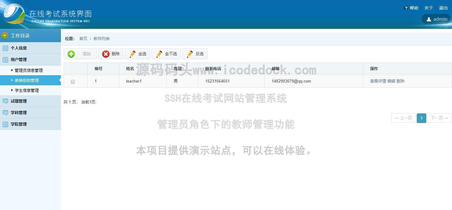 主要功能说明: 管理员角色包含以下功能:管理员登录,教师管理,学生管理,选择判断多选简答题管理,学科管理,学院管理等功能。