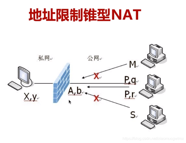 左边是内网自己的IP地址和端口X,y,通过防火墙转换之后形成外网的IP地址和端口A,b,外边的三台主机要想与内网的主机进行通讯的时候,首先要由内网的主机向外请求,请求外网中的某一台主机,这样会在NAT上打一个洞,形成一个外网的IP地址和端口,然后其他的主机只要获得了这个IP地址和端口都可以通过防火墙与内网主机进行通讯。