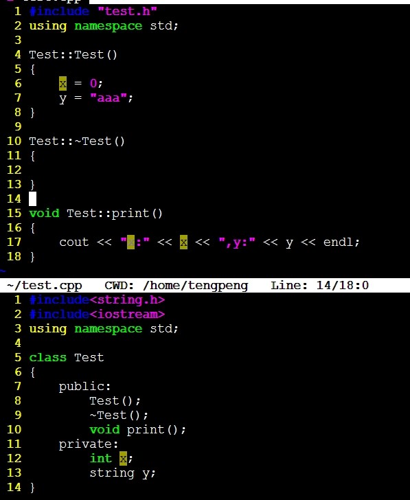 先来看一下多文件编辑的功能吧,当输入vim test.h test.cpp这样就可以多文件编辑,只要用命令:n,:N来切换文件,并且其中一个文件中复制的内容在另一个文件中可以使用。