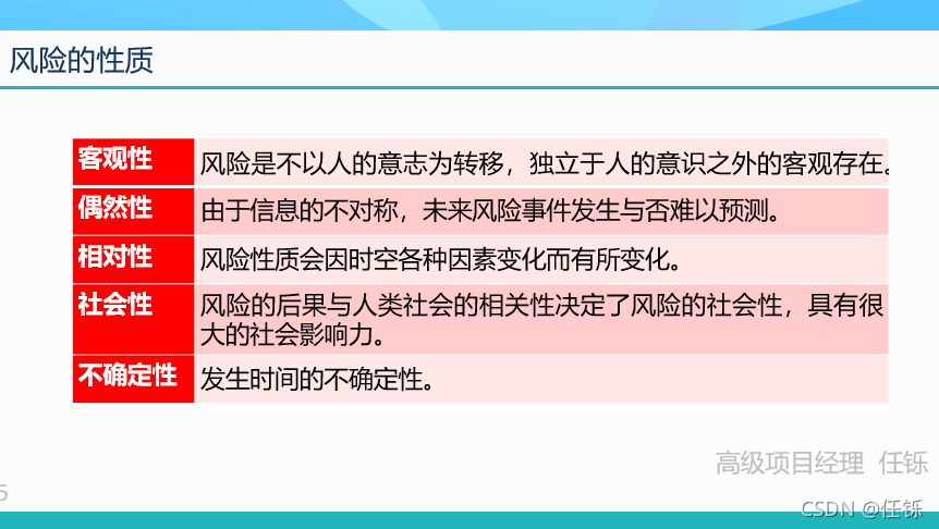 风险具有一些特性。其中, ( 1 )指风险是一种不以人的意志为转移,独立于人的意识之外存在; ( 2 )指由于信息的不对称,未来风险事件发生与否难以预测; ( 3 )指风险性质会因时空各种因素变化而有所变化。