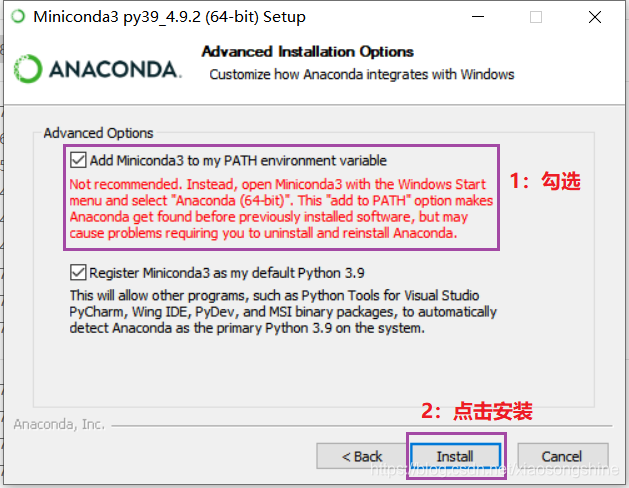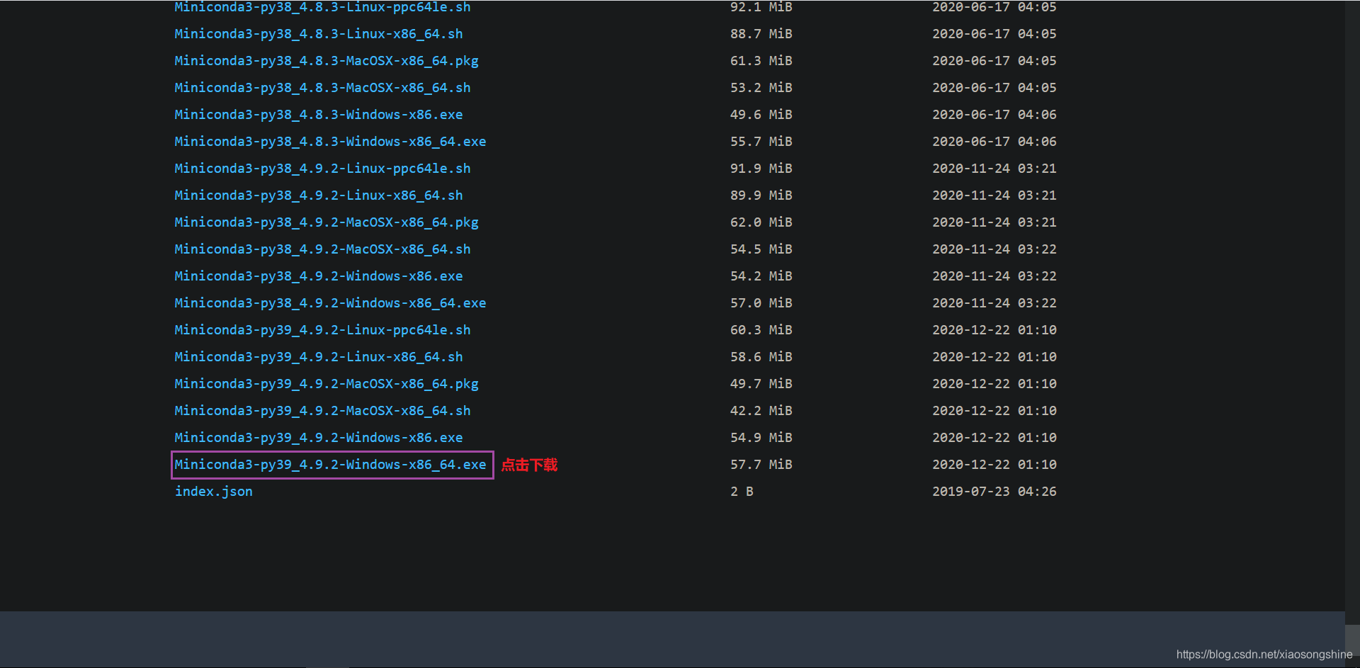 这里笔者使用的是Miniconda3-py39_4.9.2-Windows-x86_64.exe,下载链接: