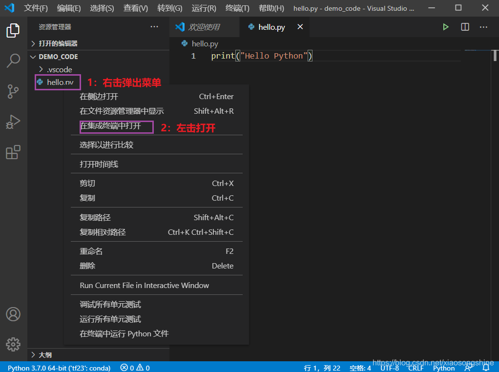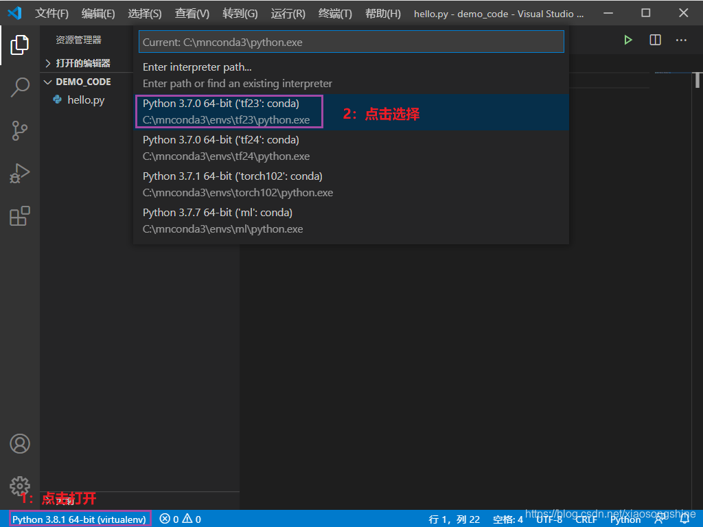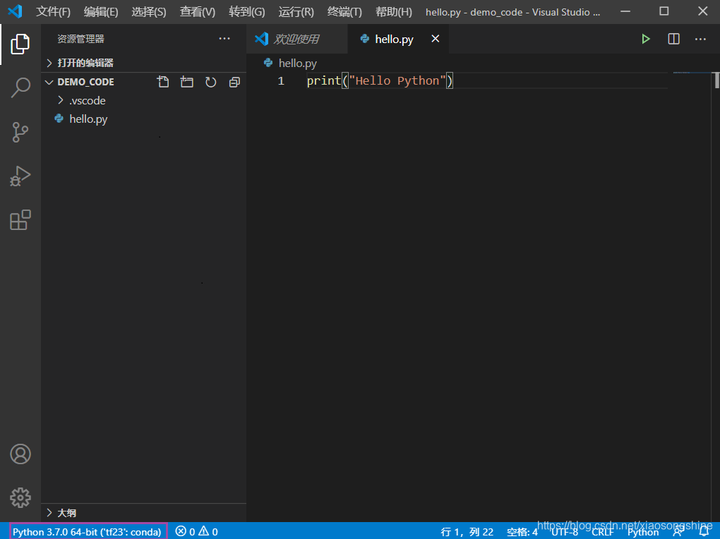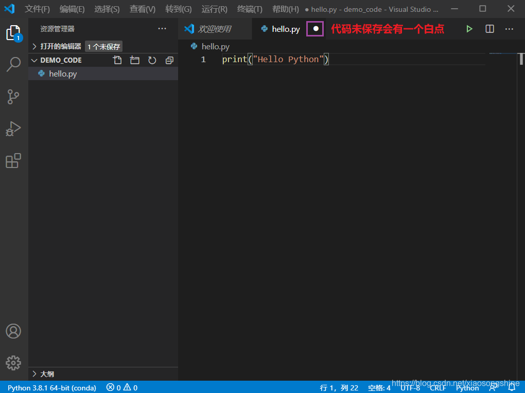 细心的小伙伴已经发现在上图界面左下角有了“Python 3.8.1 64-bit(conda)”提示,其实这个就是当前 Python 的环境,这个只有文件文件夹存在.py文件(我们新建了“hello.py”),而且安装 Python 插件后才能出现(上面已安装)。