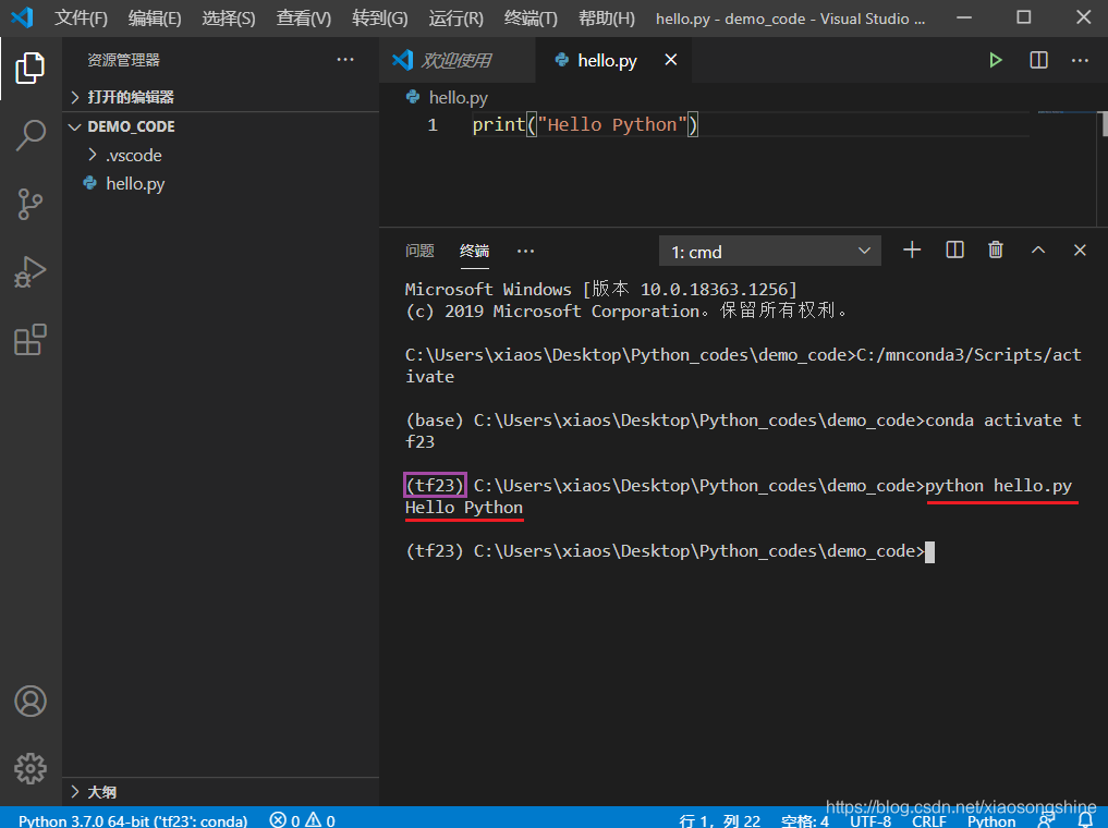 此时输出为“Hello Python”,则表示运行成功,以后再运行某个代码在此终端输入: