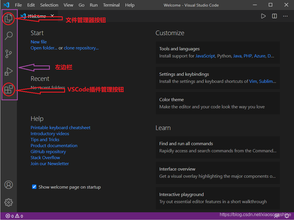 在上图左边栏中,从上到下依次为:“文件管理管理按钮”、“搜索按钮”、“代码管理按钮”、“运行与调试按钮”以及“插件管理按钮”。开发 Python 需要大家会用“文件管理管理按钮”与“插件管理按钮”功能。