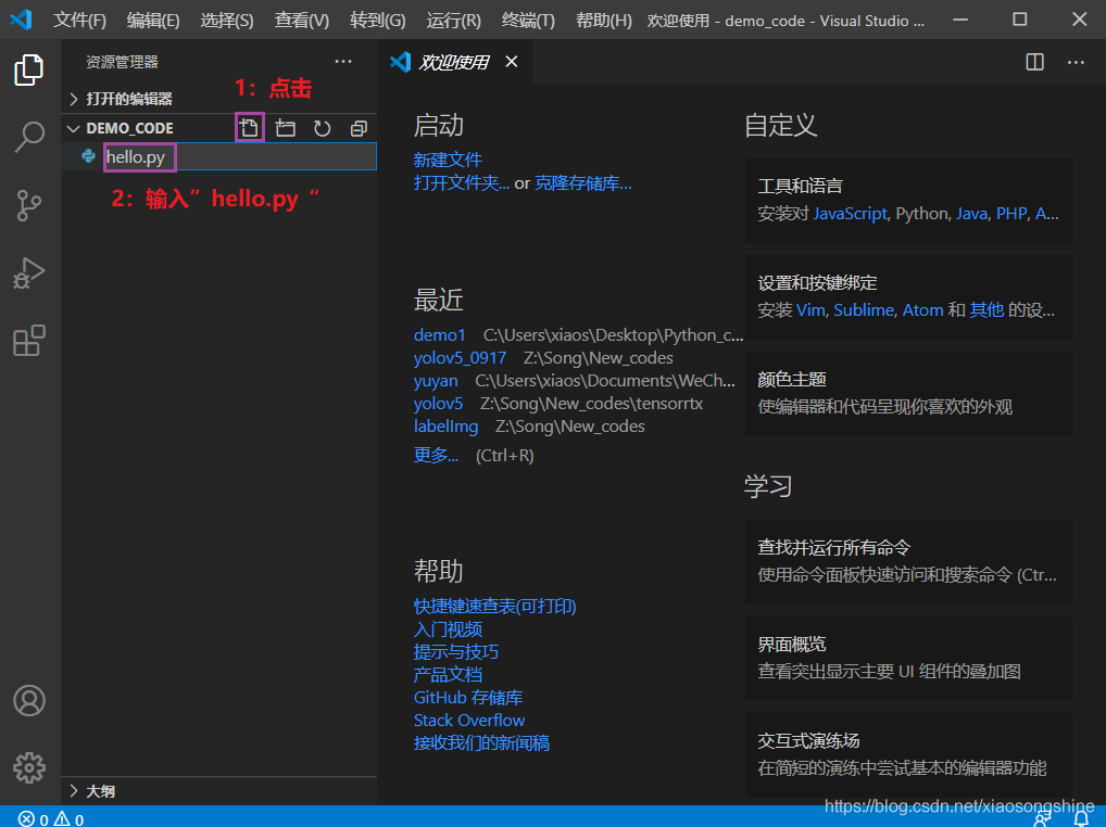 打开后,我们就可以在 VSCode 的资源管理器看到这个目录了,只是还没有文件,我们可以通过资源管理器的“新建文件”与“新建文件夹”按钮新建资源。按照下图所示,新建一个“hello.py”文件。