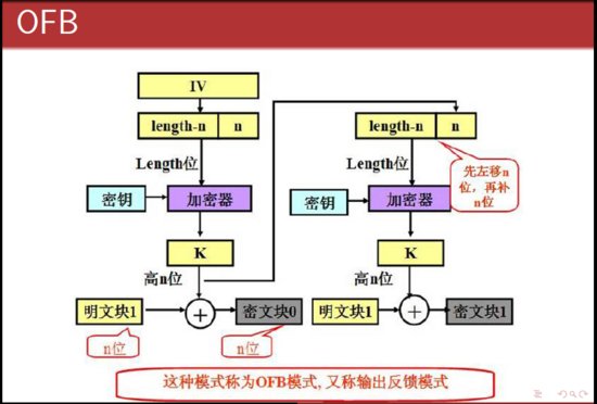 密码算法的输出(指密码key而不是密文)会反馈到密码算法的输入中,OFB模式并不是通过密码算法对明文直接加密,而是通过将明文分组和密码算法的输出进行XOR来产生密文分组。