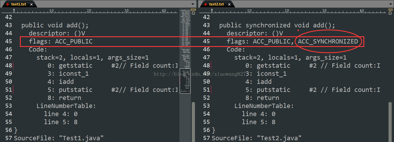 观察可知两个反汇编文件仅有一个地方不同:加入synchronized关键字的的文件,add方法下,flags后多了一个ACC_SYNCHRONIZED。