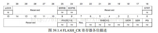 第三个要介绍的是FLASH控制寄存器:FLASH_CR。该寄存器的各位描述如图所示: