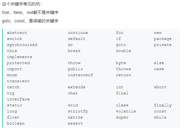 2. 不能是关键字(有两个保留关键字,goto,const,关键字都是小写的)或者显式常量(null,true,false)。
