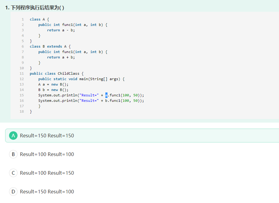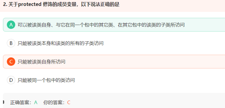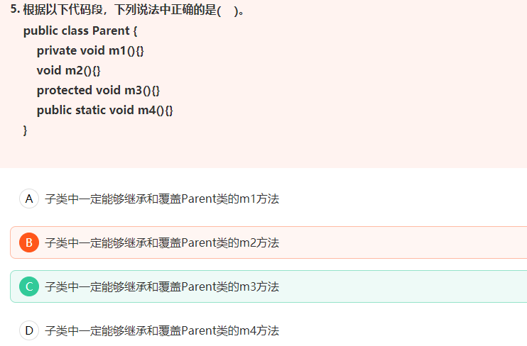 public和protected都可以作用于子类,但在多态情况下,静态函数调用时编译和运行看左边,所以子父类存在同名静态函数访问的是父类,子类并不能覆盖父类的方法,所以选C