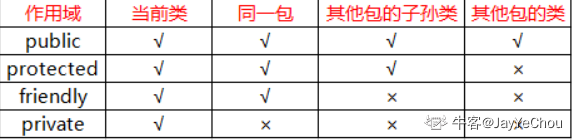 default | 它是针对本包访问而设计的,任何处于本包下的类、接口、异常等,都可以相互访问,即使是父类没有用protected修饰的成员也可以。 |