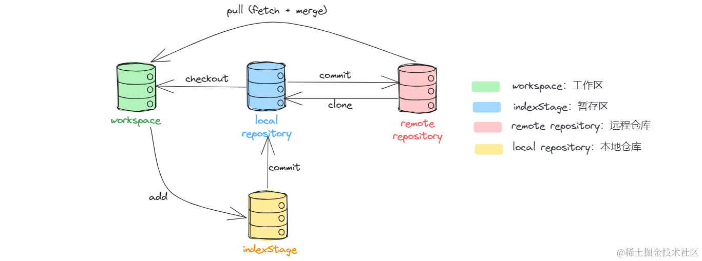 git有好几个区,工作区(workspace)、暂存区(indexStage)、本地仓库(local repos