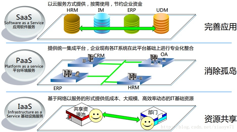 在逐步迁移式升级过程中,通过业务梳理、管理整合、技术复用,可以设计出很多PaaS上的服务,为应用提供技术服务,迁移后的应用可以演化为SaaS服务。
