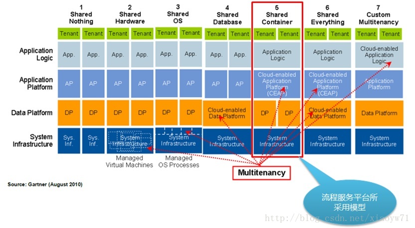 首先,Gartner按照4个层次对多租户模型进行划分,即基础设施层(主要是指各种服务器)、数据层(即数据库层)、应用平台层(即应用运行的容器,通常也称为应用服务器)、以及应用逻辑层(即应用功能)。如下图所示: