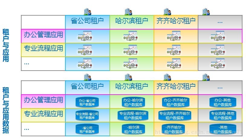 租户划分模型有很多,具体操作按需求进行分析,上图所示的是以地域来划分租户的;也可以按应用业务范围划分租户,也可以组合方式划分租户。