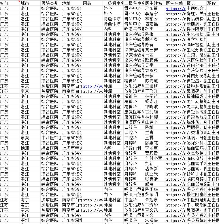 医院名称 医院级别 省份 城市 医院类别 地址 网站 一级科室名称 二级科室名称 医生姓名 医生头像 擅长 职称 学术职称 好大夫荣誉 获奖荣誉 推荐评分 患者数量 专业 总访问量 科普文章数量 总患者数 诊后报到患者数 诊后评价数 心意礼物数 注册时间 诊后两年内好评 社会职务 科研成果 医生介绍