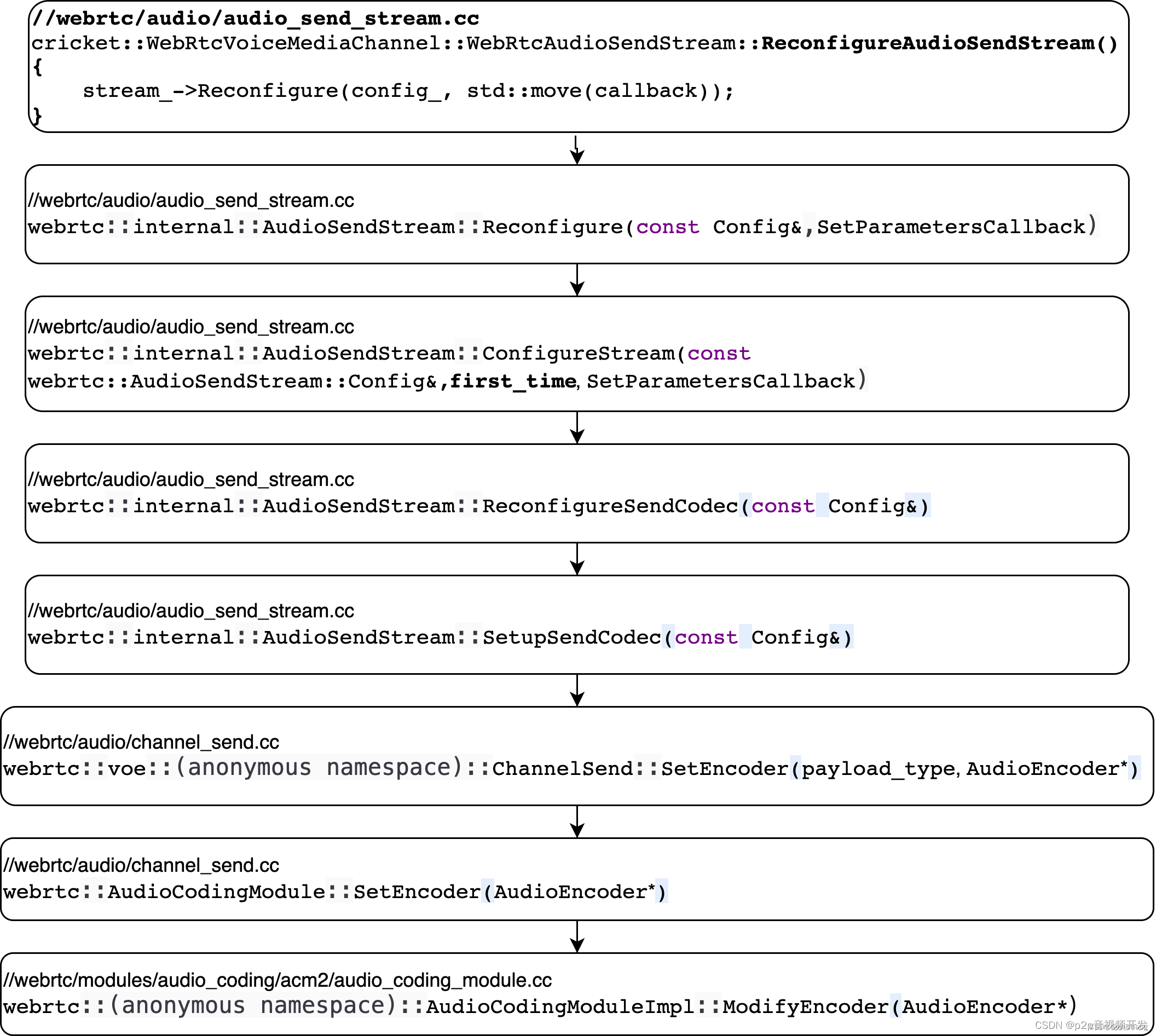 在WebRTC中,音频起始于VoiceEngine,而VoiceEngine中WebRTCVoiceMediaChannel是非常重要的对象,其调用 webrtc::Call 创建创建新的AudioSendStream对象,创建时传递的参数config_是 webrtc::AudioSendStream::Config 类型,包含与编解码、比特率、RTP、加密以及 webrtc::Transport 等配置。