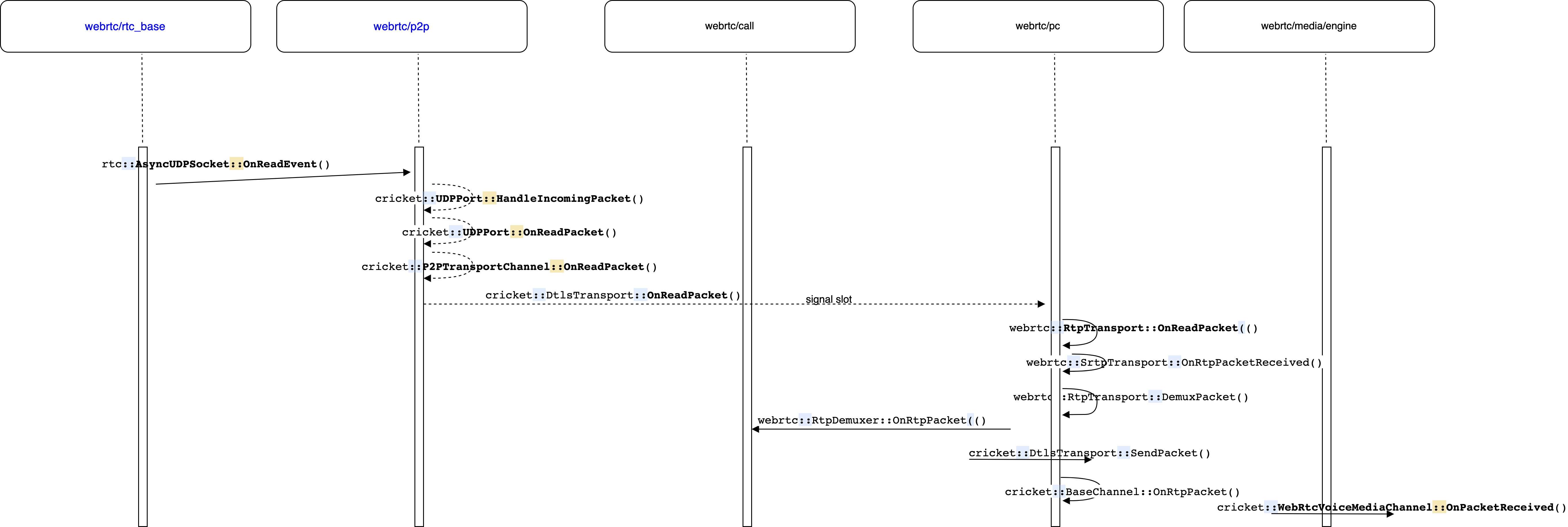 RTP包从cricket::DtlsTransport::OnReadPacket到webrtc::RtpTransport::OnReadPacket则是通过信号异步通知,RtpTransport::OnReadPacket和信号绑定的函数如下: