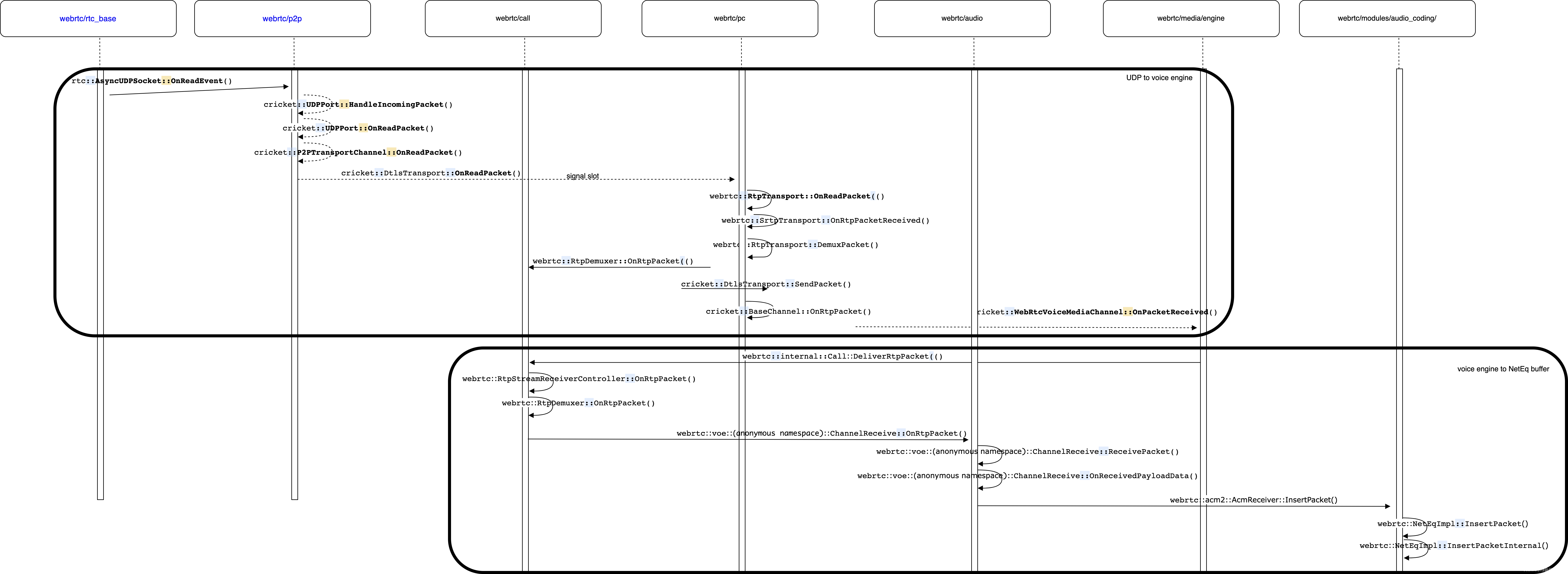 在3.8.1小节最后,call_->Receiver()->DeliverRtpPacket是在新线程中调用的,其将RTP数据包传递到了voice engine层,由于网络存在丢包、抖动等非理想因素,因而在满足实时性的要求下还要进行抗丢包和去抖动,NetEQ模块就可以处理一部分抖动和丢包,当然编码器也可能有自己的丢包补偿算法,比如G7XX、Opus编码器,这就可能并不会启动NeteQ的丢包算法,但是抗抖动都依赖于NetEQ处理。将RTP数据包添加到NetEQ buffer的调用流程如下图所示: