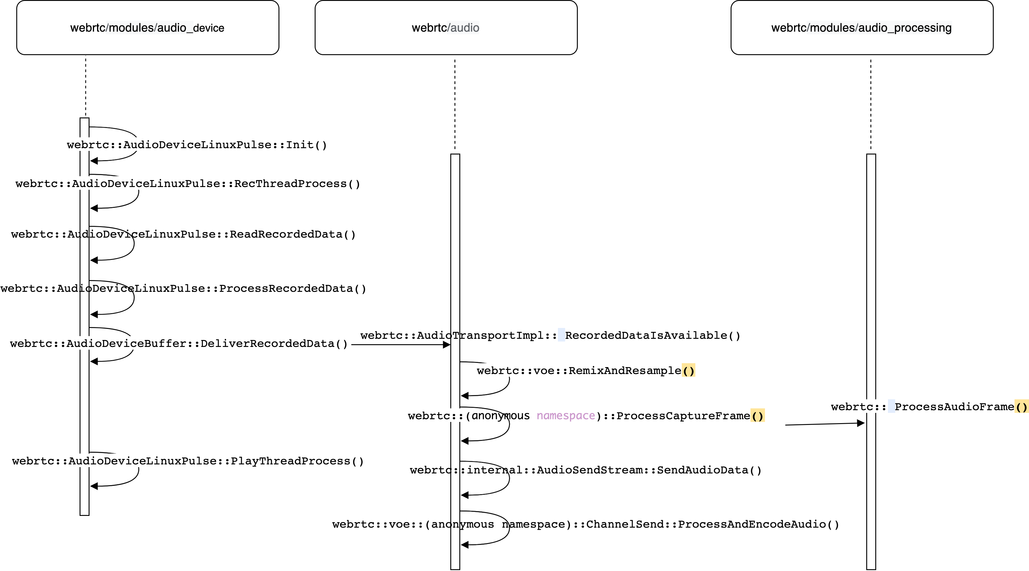 由于声音是连续的,和音频采集一样,播放也是流式的,在WebRTC中采用10ms播放一次音频数据,因而采用单独的播放线程来播放音频数据,对于Linux平台,音频播放线程的创建在音频设备初始化阶段,对采用PulseAudio框架实现的音频设备管理的初始化如下,在其实现上采用lambda表达式创建采集和播放线程。