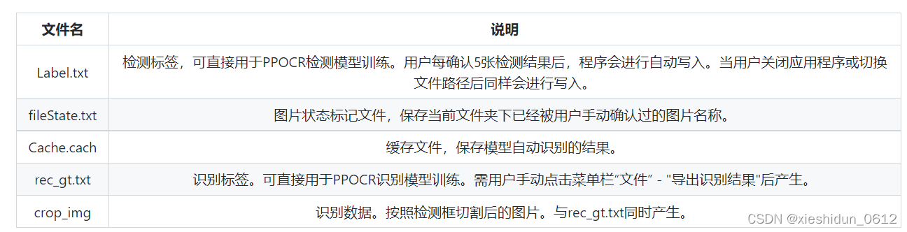4)导出结果:用户可以通过菜单中“文件-导出标记结果”手动导出,同时也可以点击“文件 - 自动导出标记结果”开启自动导出。手动确认过的标记将会被存放在所打开图片文件夹下的Label.txt中。在菜单栏点击 “文件” - "导出识别结果"后,会将此类图片的识别训练数据保存在crop_img文件夹下,识别标签保存在rec_gt.txt中[4],标注的目录下有新增文件和目录如下图