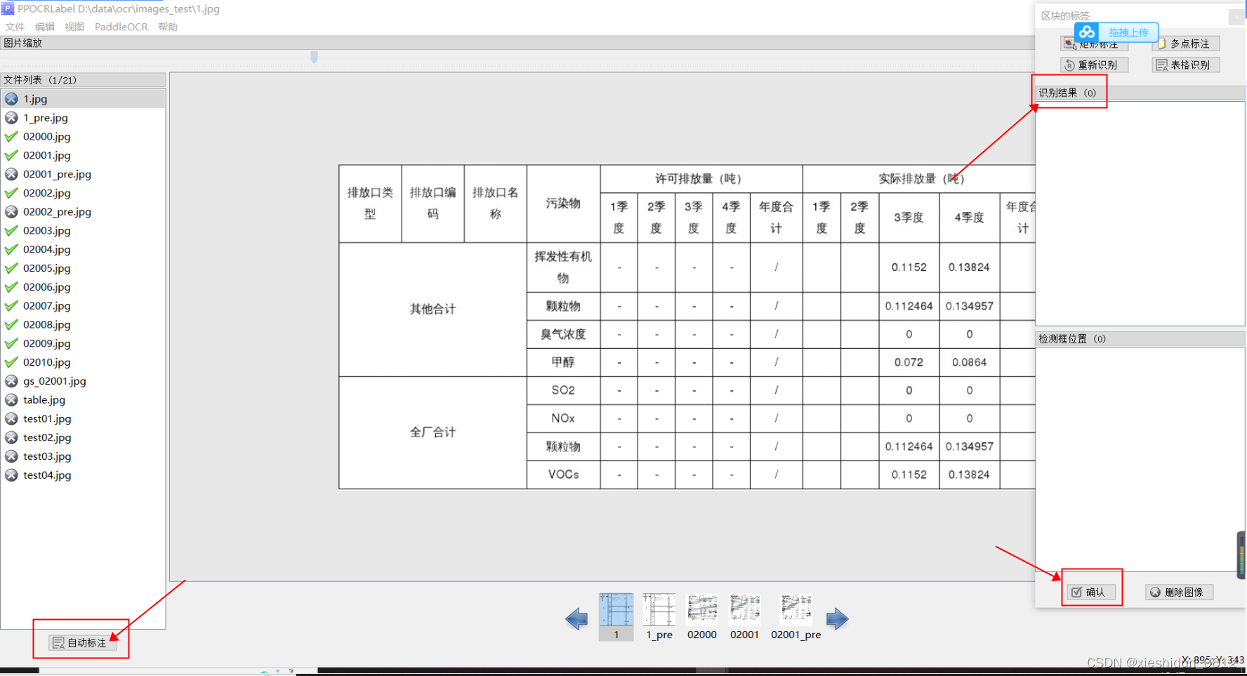 2)点击右下角的自动标注,这时ppocrlabel会把你的数据全部预标注了一边,再看右边的识别结果是否是正确,不正确就双击对应的识别结果重新修改,修改完成后点击有右下角的确认,这样就标注好一张图片了,如下图