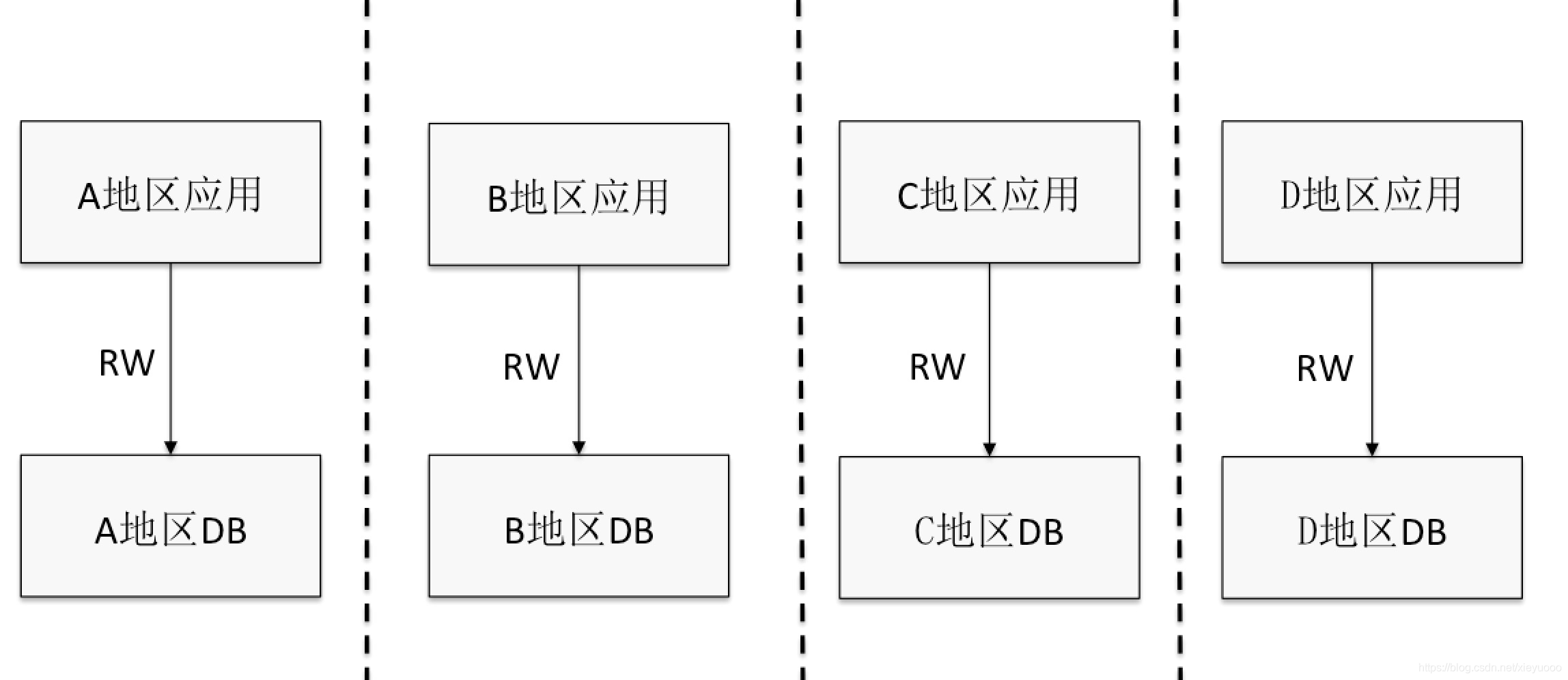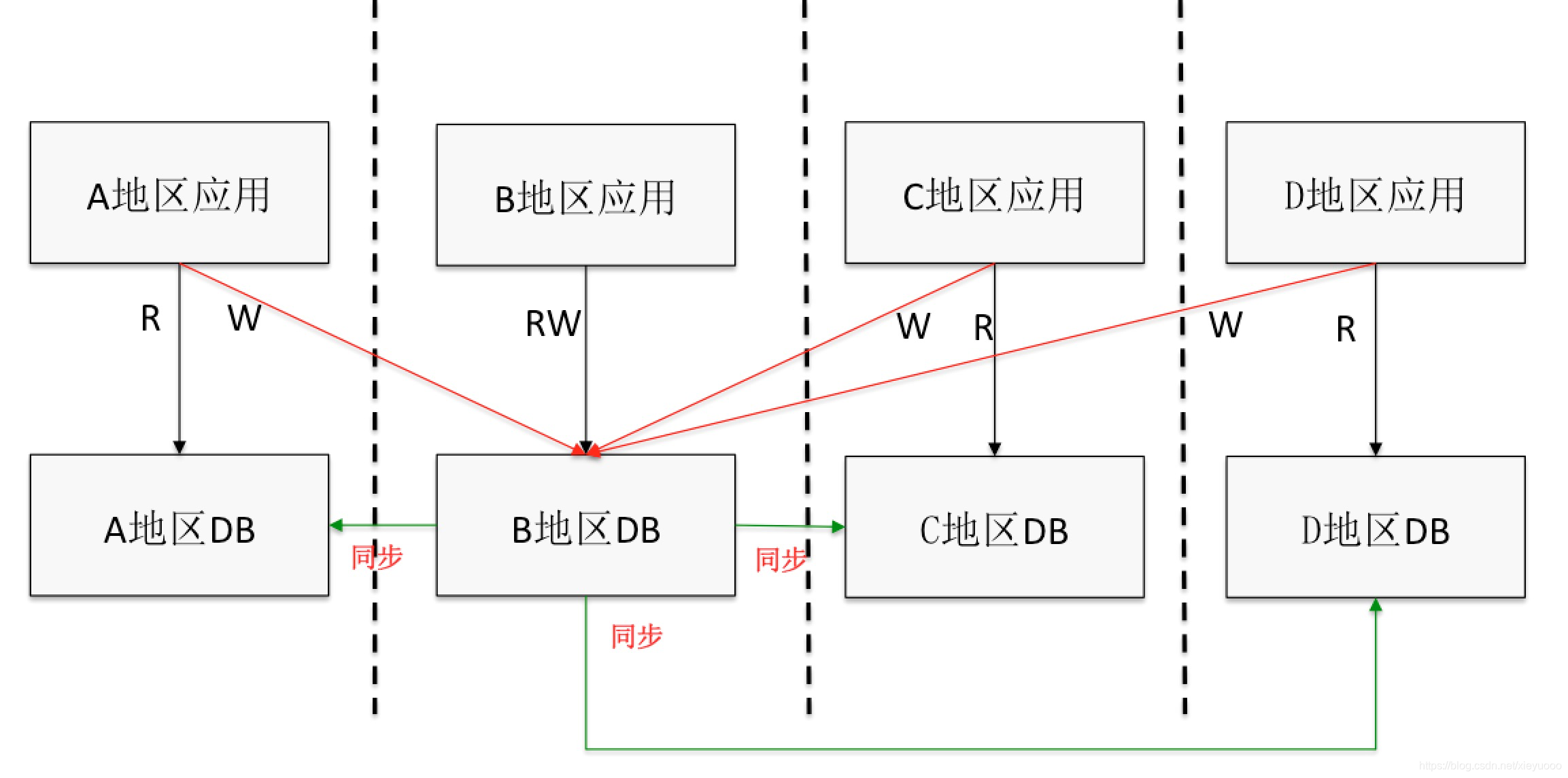 3、每个地区或国家都存在写入,然后彼此之间通过系统或底层数据同步工具相互同步。