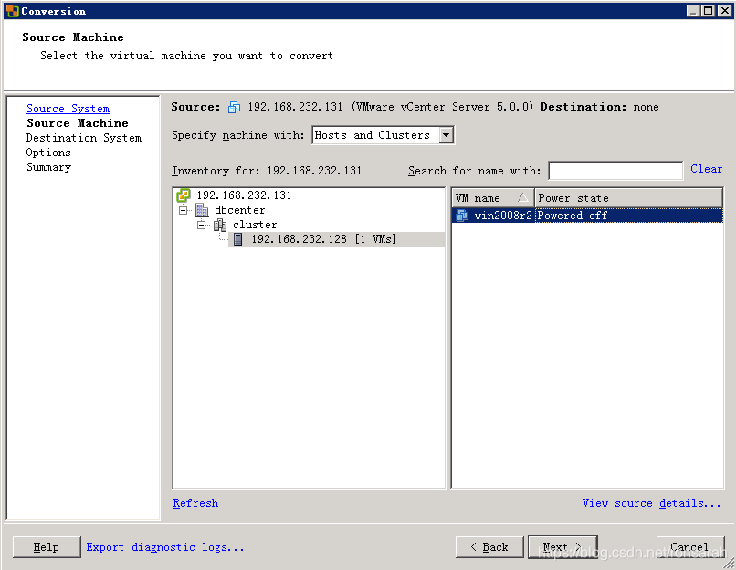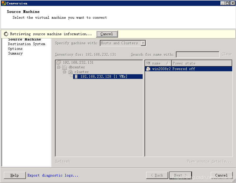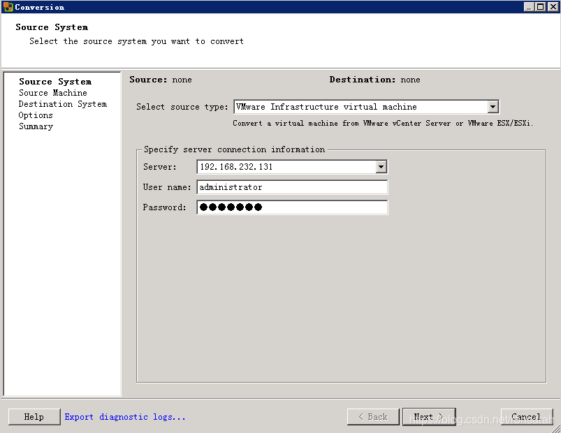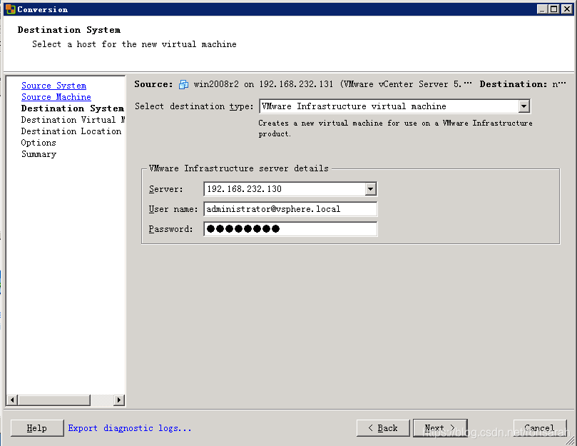 选择源类型“VMware Infrastructure virtual machine”,并输入源虚拟机所在的vCenter或Esxi主机的用户名密码,如下图: