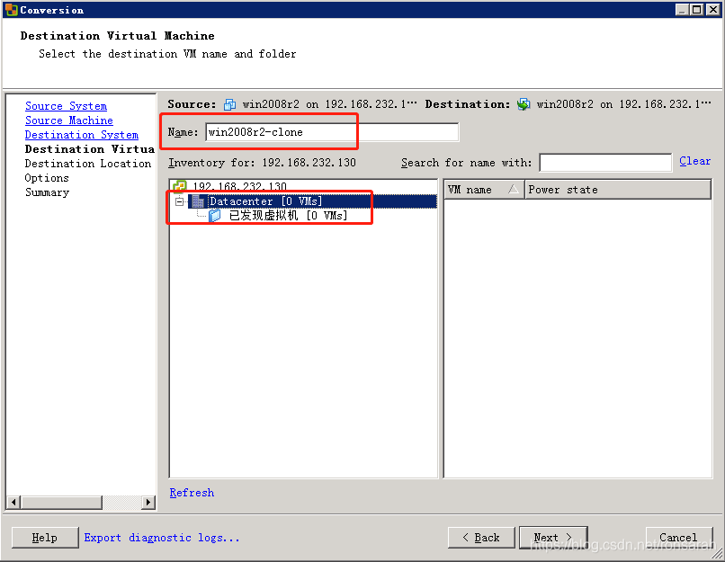 修改目标虚拟机的名称,并选择目标vCenter的数据中心,如下图: