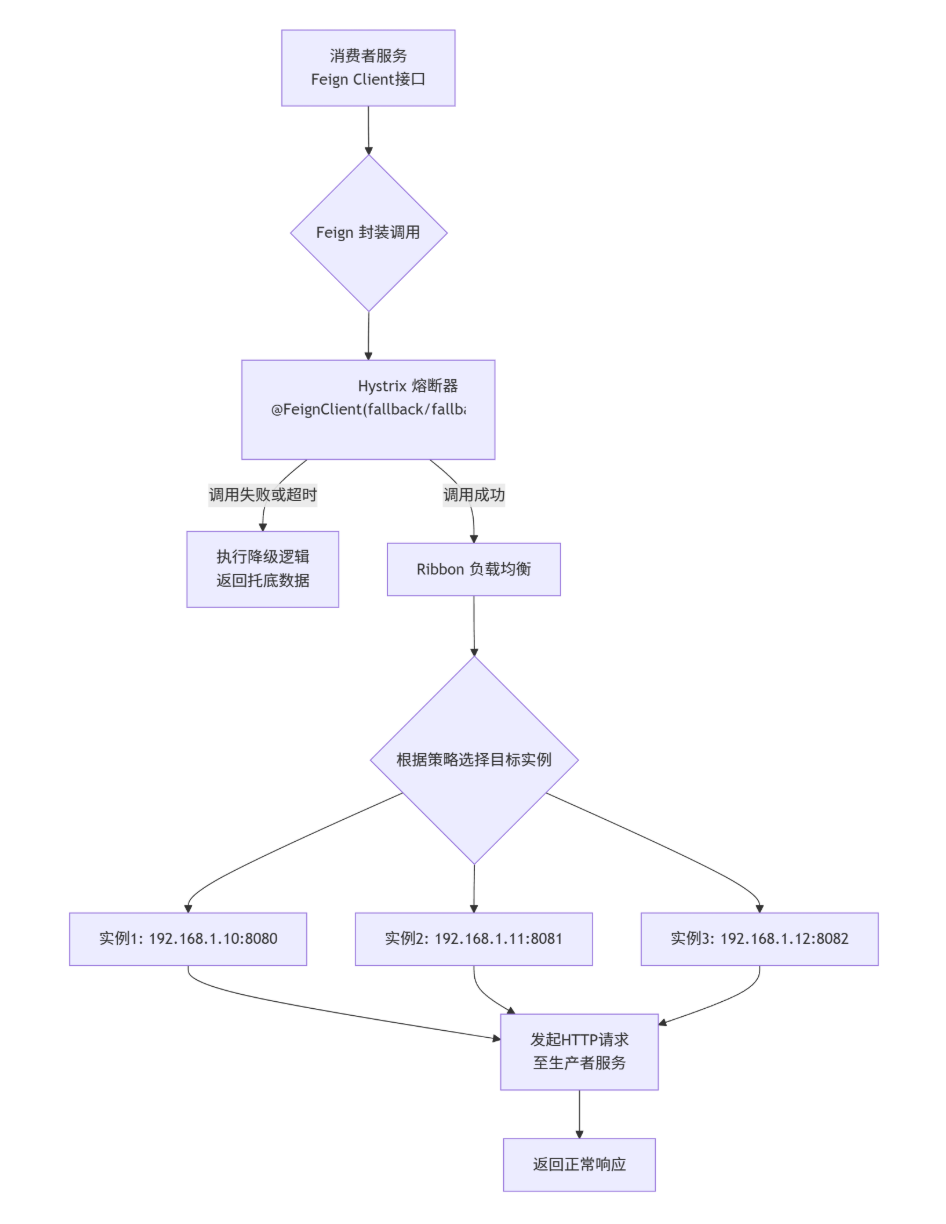 当通过服务名(而不是具体的 IP:Port)调用服务时,Feign 会通过 Ribbon 从服务注册中心(如 Eureka, Nacos)获取该服务名下的所有实例列表,并根据负载均衡策略(如轮询、随机)选择一个实例发起请求。