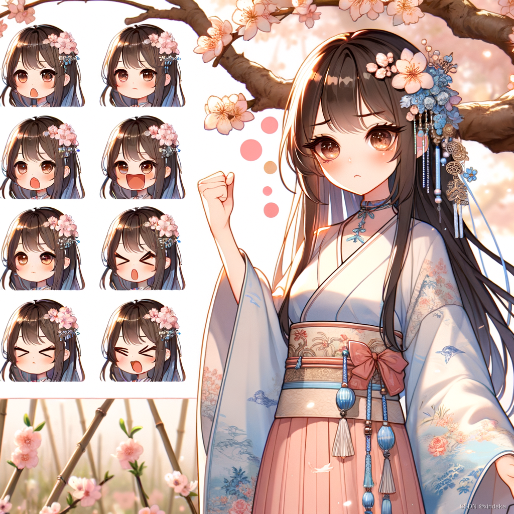 可爱的少女,动漫,二次元,国风,樱花树,头像,表情包,艺术设计 首先,提取分析出,需要重点组成的词组,作为核心AI绘画创作设计元素之一,比如,动漫,首个描述词,添加风格关键词搭配,二次元,少女,女孩等,人物类描述,之后再添加次级关键词组成,如类型,头像,表情包,表情属性等标签,最后一组词汇,艺术化,设计创意等;头像,表情包,每一张设计一个头像表情包,按九宫排列,9张表情包,一个美丽的小女孩,二次元动漫,杰作,官方艺术效果,精细。可爱的少女,动漫,二次元,国风,樱花树,头像,表情包,艺术设计。那么,现在就按这一组写出完整的创作词组。附上生成的头像表情包图片。