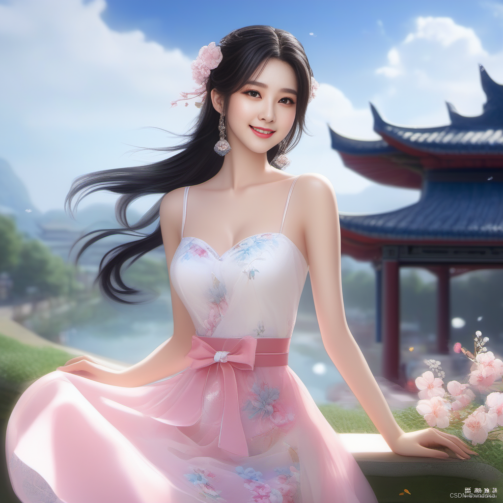 AI-SDXL-1.0生成式超精细真人写真美女 女孩,独奏,漂亮,可爱,卡哇伊,逼真的面部细节,精致的五官,黑色长发,胸大,看着观众,微笑,腮红,精致的锁骨,(粉色印花裙),(一字肩裙),水晶鞋,户外,花海,草坪,喷泉,草木,蓝天白云,微笑嘴唇,杰作,官方艺术,中文关键词:(中国女孩),