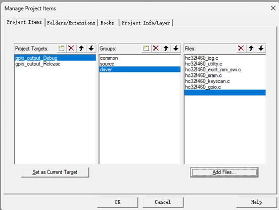 - 拷贝 hc32f460_ddl_Rev2.2.0\example\ev_hc32f460_lqfp100_v2\gpio\gpio_output\source 到 00_LED