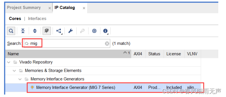 窗口点击 IP Catalog,然后在 IP Catalog 窗口直接搜索关键字“mig” ,就可以很容易的找到Memory Interface Generator(MIG 7 Series)。如下图所示。