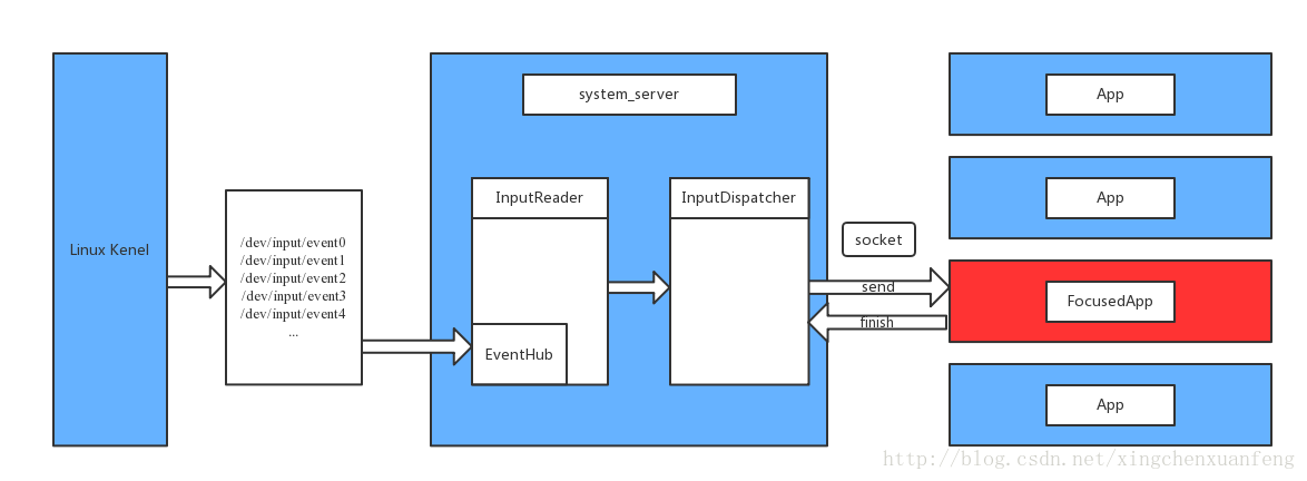 最近被问到android Input系统事件分发流程,虽然有看过相关源码,但是只是匆匆一瞥,没什么印象,解释了半天自己都晕了,甚是尴尬。特地重新看了一遍,整理在博客上,加深一下印象。