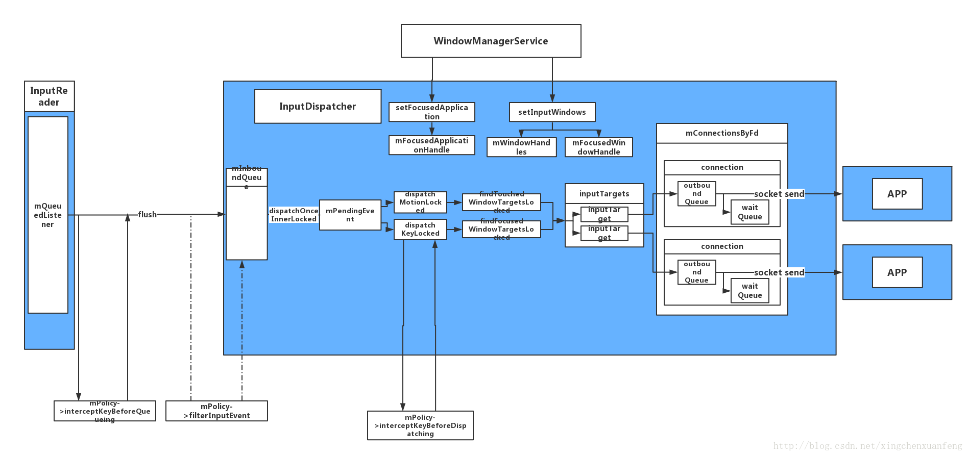3 WindowManagerService在app端setView的时候就创建了一对Socket连接,InputDispatcher利用这个Socket连接和app端通信。这里实在是有些奇怪,在android系统里,几乎所有的跨进程通信都是binder,唯独这里用了Socket,不能理解。