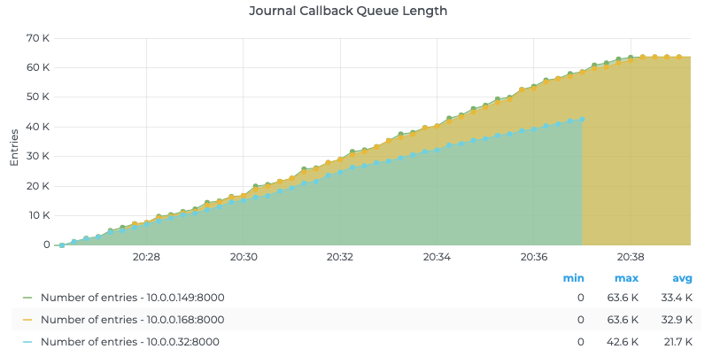 图 4:BookKeeper journal 回调队列在journalSyncData=false设置下的增长情况