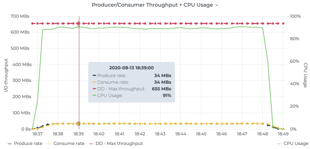 为了进一步验证这一点,我们还配置 BookKeeper 在 RAID 0 配置 中使用两个磁盘,这为 BookKeeper 提供了将 journal 和 ledger 写操作分到两个磁盘上的机会。我们观察到,Pulsar 最大限度地利用了磁盘的联合吞吐量(~650 MB/s),但峰值稳定吞吐量仍然限制在 ~340 MB/s。